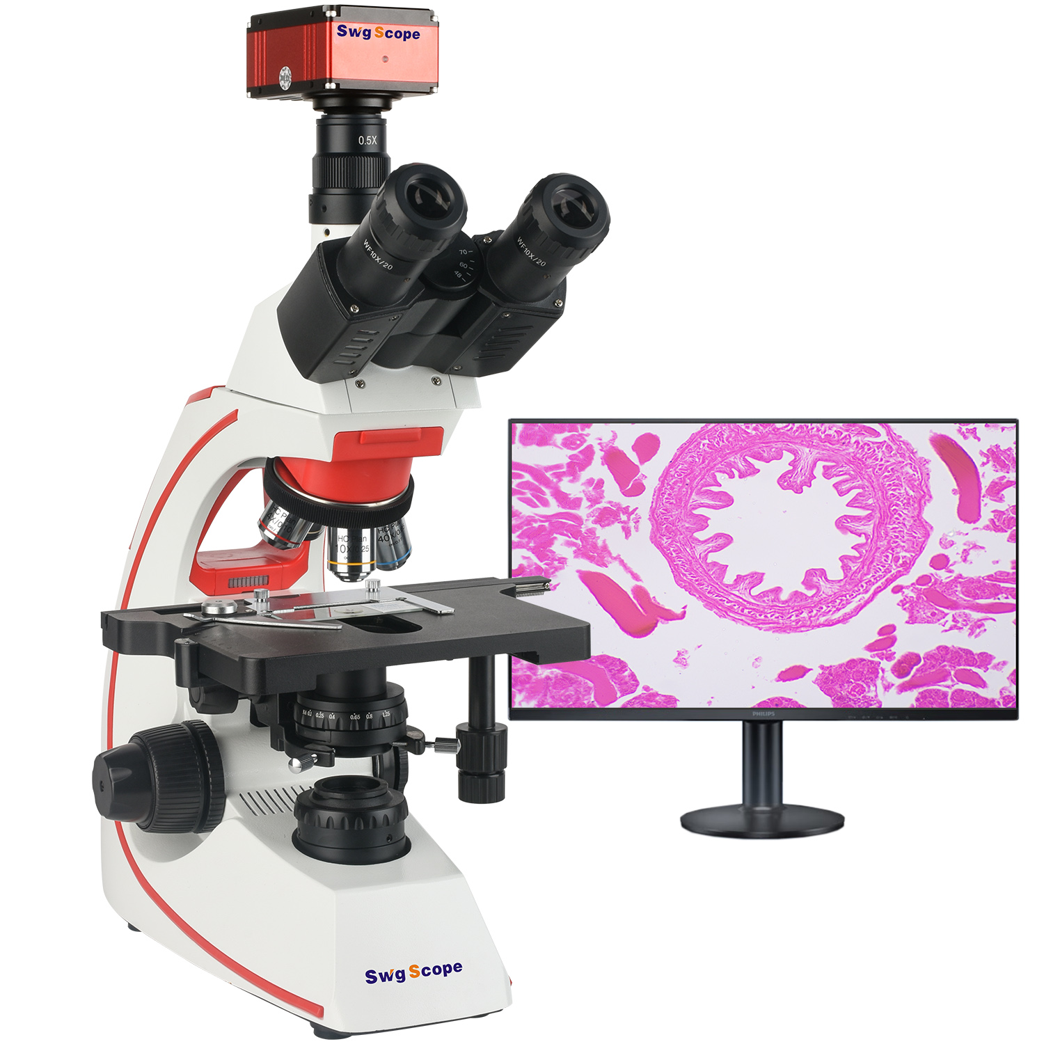 无限远铰接三目镜:30°倾斜,360°可旋转瞳距:48-76mm(通过目镜和三目接口同时观察,无需切换)