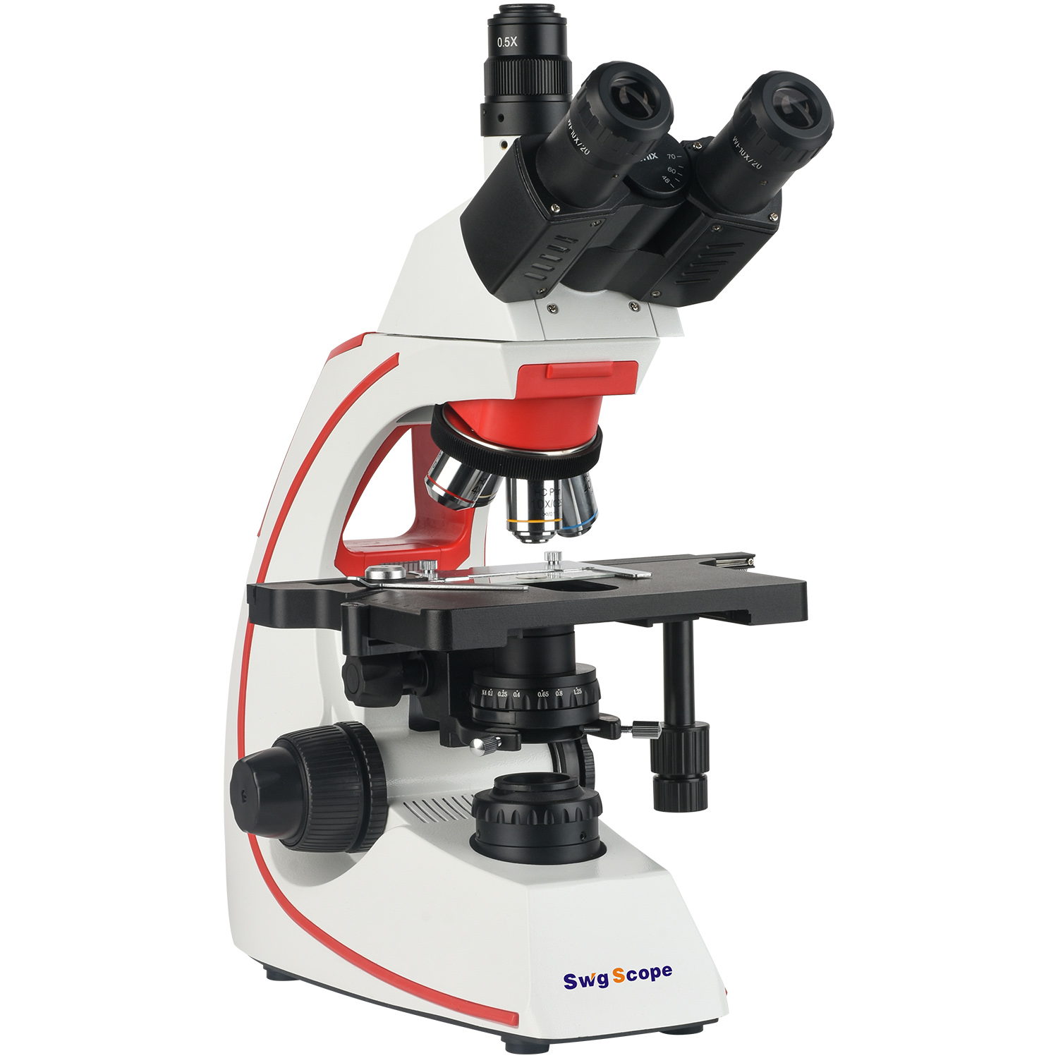 无限远铰接三目镜:30°倾斜,360°可旋转瞳距:48-76mm(通过目镜和三目接口同时观察,无需切换) |